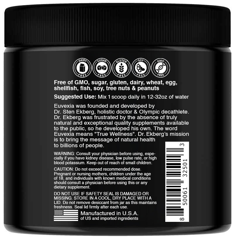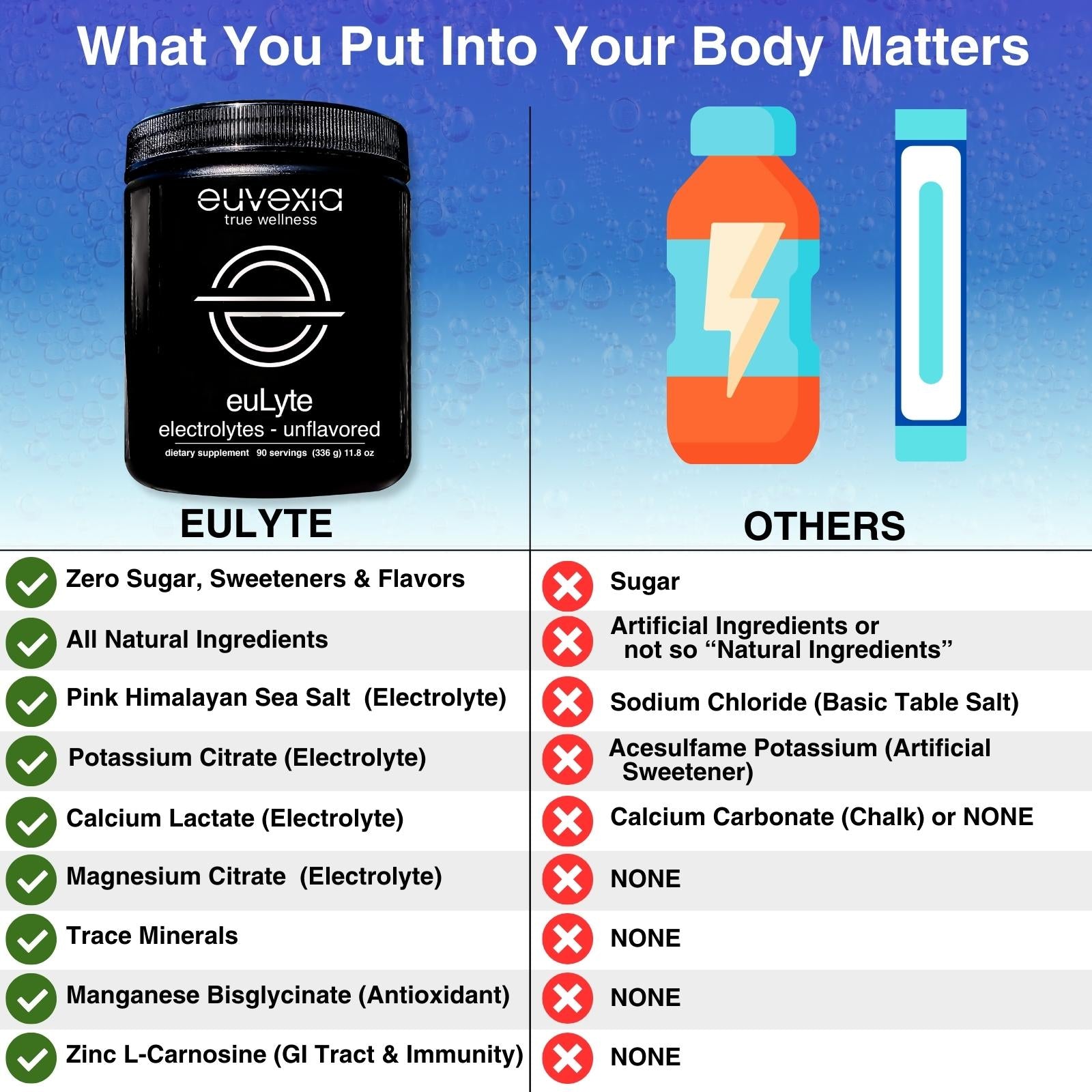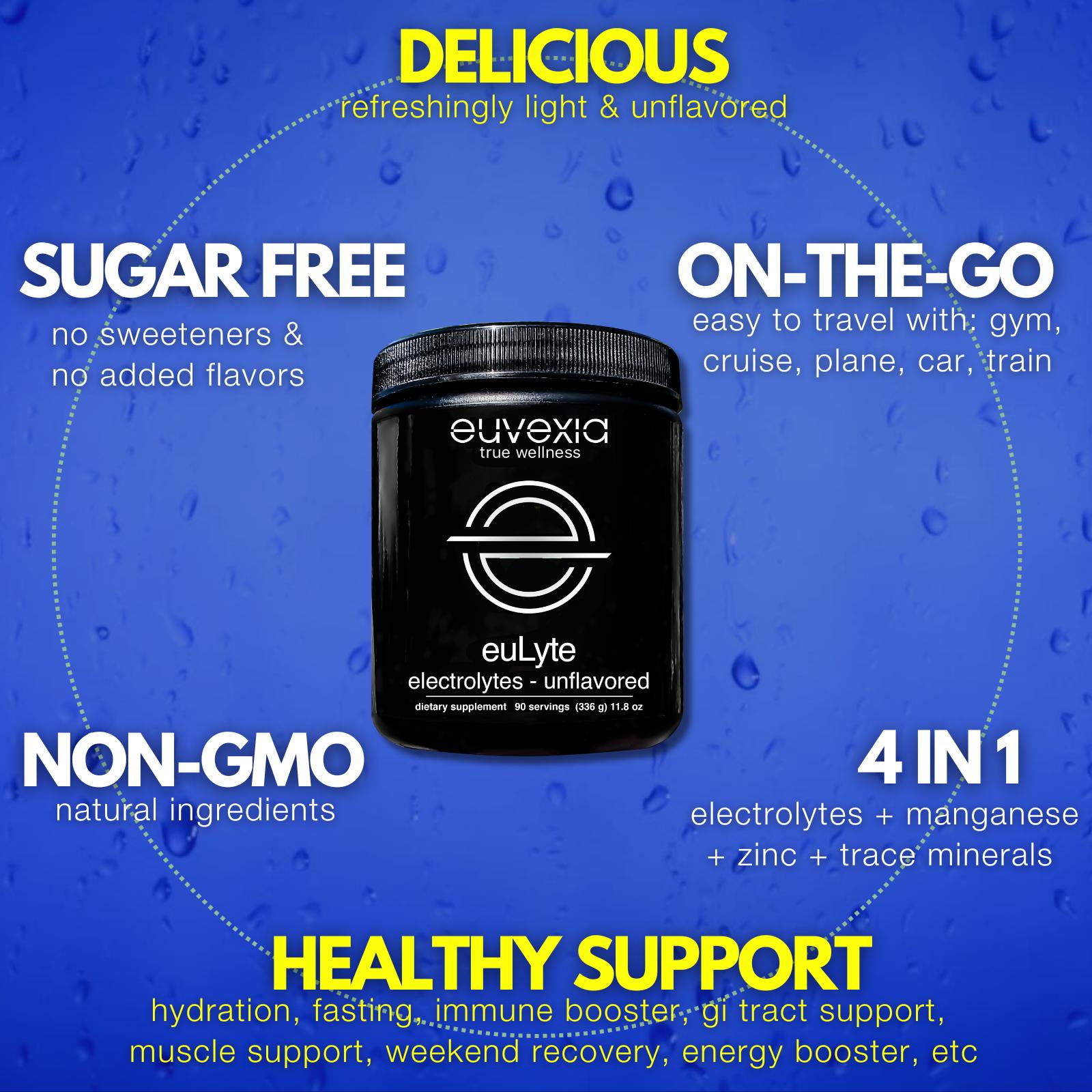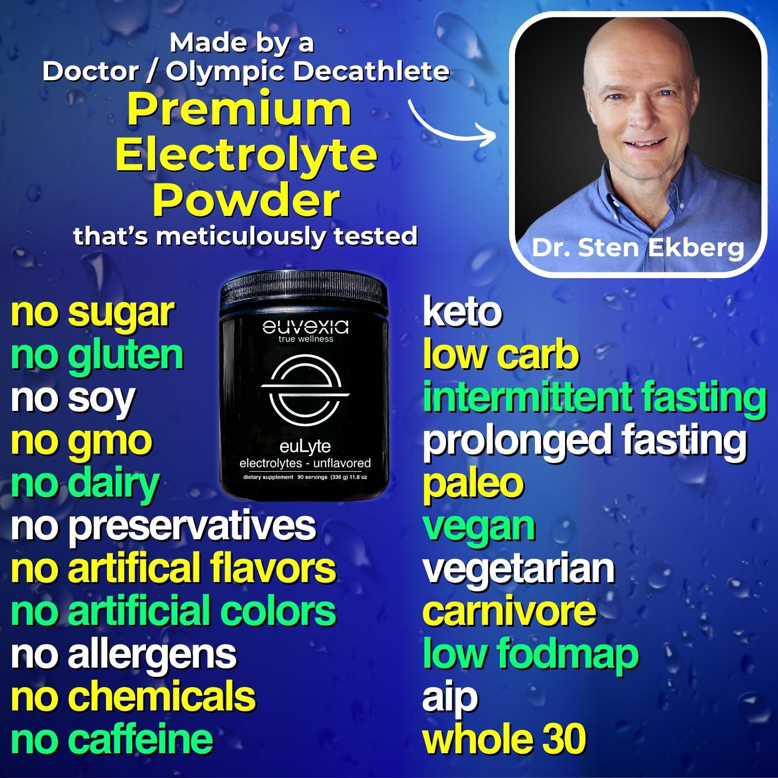 • DEVELOPED BY OLYMPIC DECATHLETE & DOCTOR, DR. STEN EKBERG: Euvexia euLyte's Unflavored Natural Electrolytes Powder Formula is designed to support overall health for everyone, not just athletes. FREE from cheap fillers (sugar & table salt), dyes, GMOs, soy, egg, corn, dairy, nuts, yeast, caffeine, gluten, magnesium stearate, artificial preservatives, artificial ingredients, artificial sweeteners (sucralose, saccharin, acesulfame potassium, aspartame). Ideal for health-conscious individuals #HealthChampions