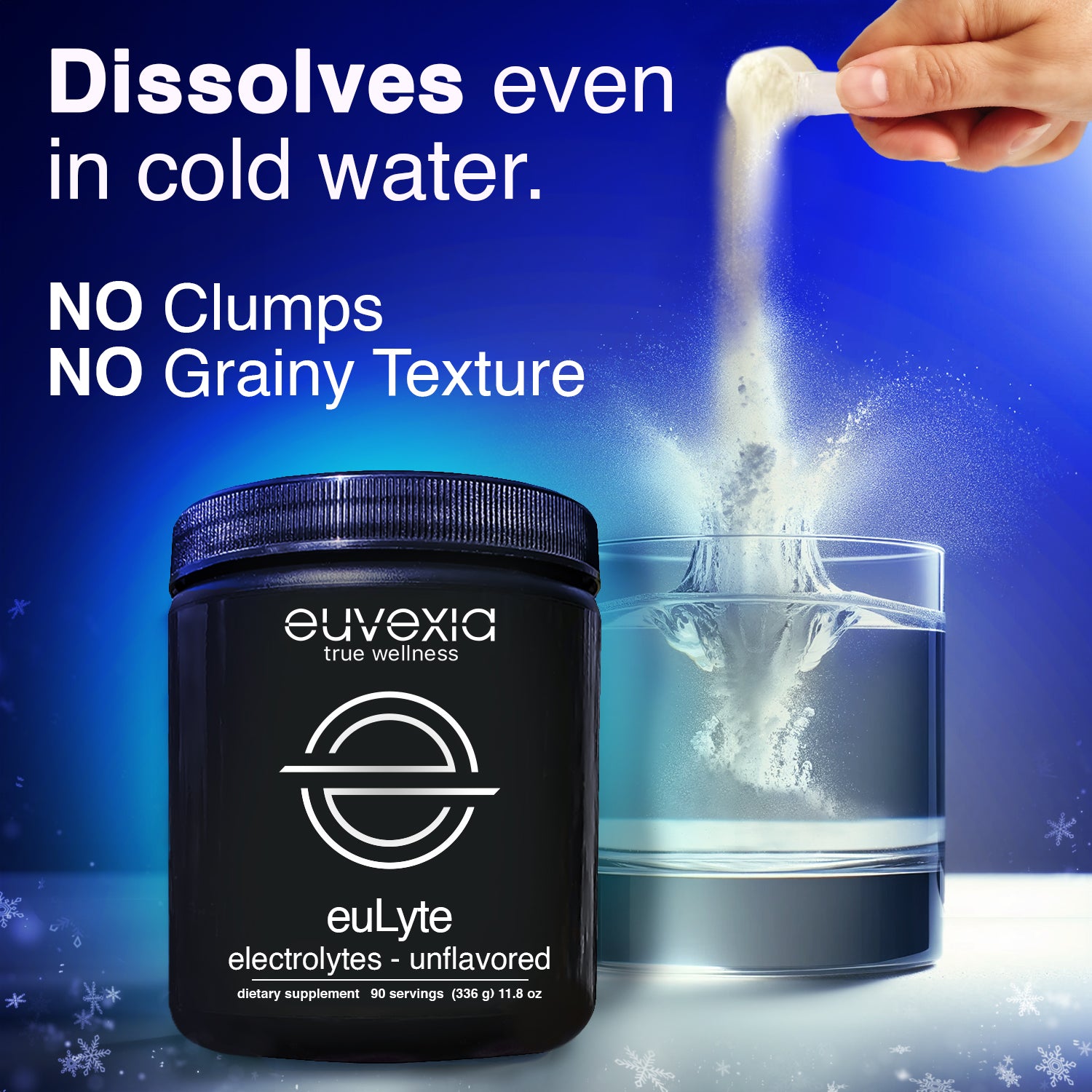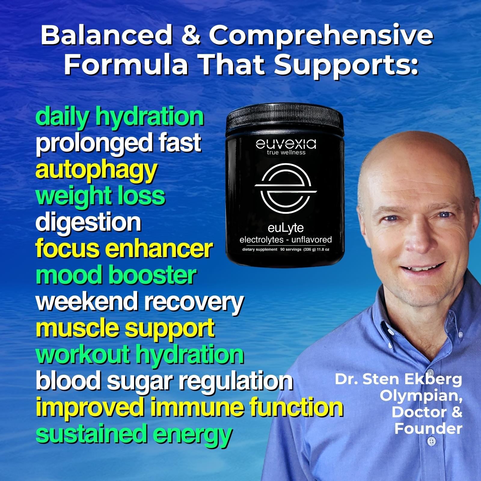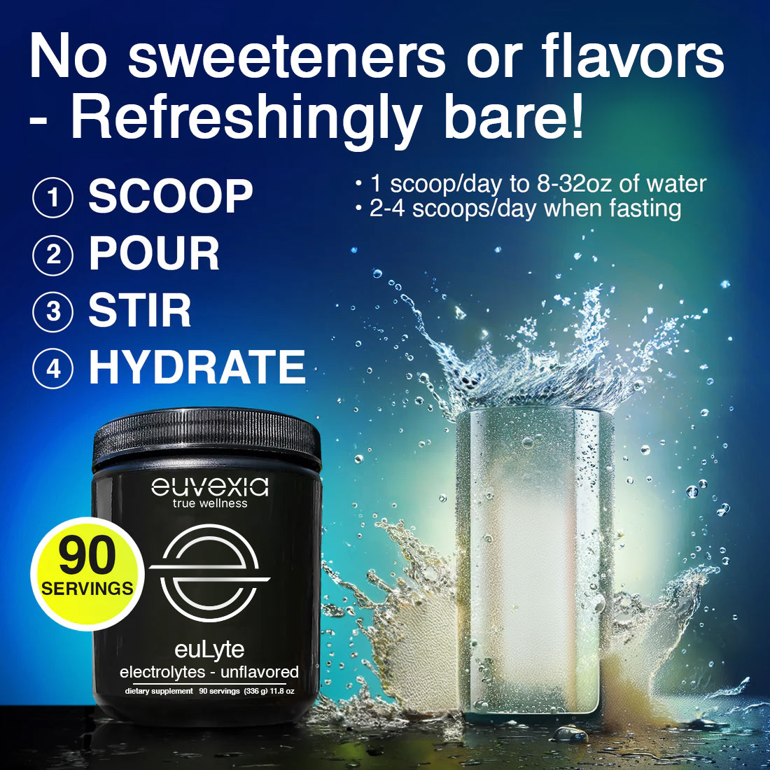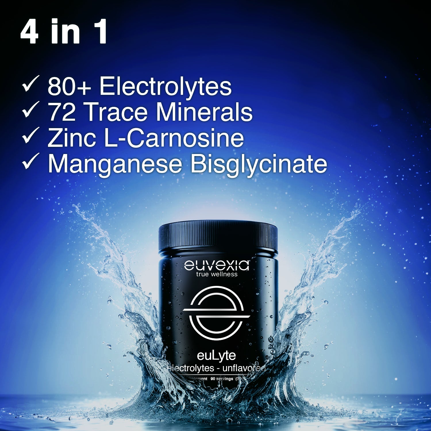 • DEVELOPED BY OLYMPIC DECATHLETE & DOCTOR, DR. STEN EKBERG: Euvexia euLyte's Unflavored Natural Electrolytes Powder Formula is designed to support overall health for everyone, not just athletes. FREE from cheap fillers (sugar & table salt), dyes, GMOs, soy, egg, corn, dairy, nuts, yeast, caffeine, gluten, magnesium stearate, artificial preservatives, artificial ingredients, artificial sweeteners (sucralose, saccharin, acesulfame potassium, aspartame). Ideal for health-conscious individuals #HealthChampions