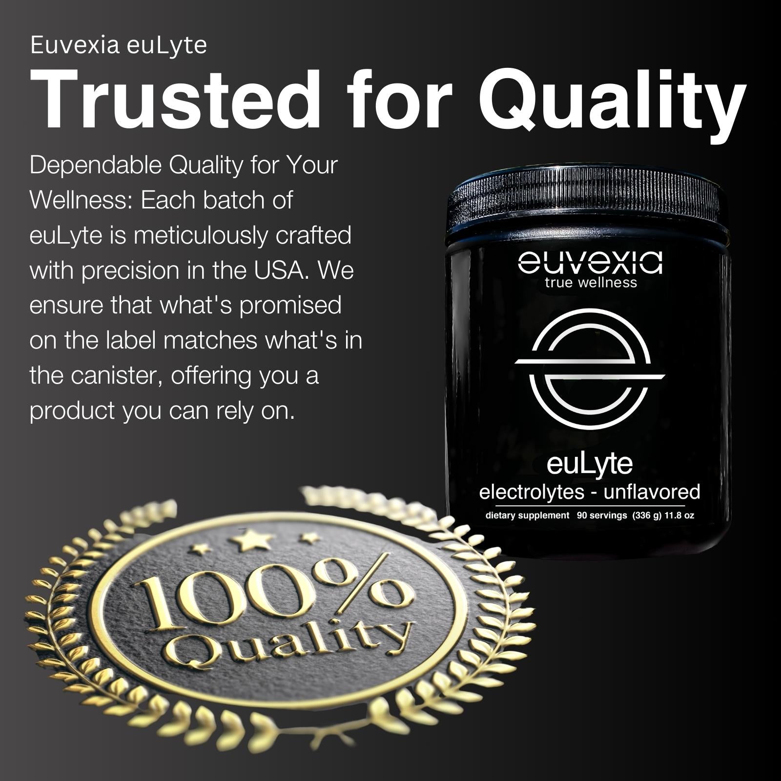 • MADE IN USA & STRICTLY TESTED: Euvexia's euLyte electrolytes powder is manufactured in a state-of-the-art facility located in the USA and extensively tested for purity. Our FDA-registered, NSF GMP-certified, and cGMP-certified facility follows strict quality standards (cGMP ensures the latest methods and technologies, while GMP meets basic quality standards). These facilities are uncompromising when it comes to cleanliness and quality control. Euvexia electrolytes proudly undergo third-party testing on every batch.