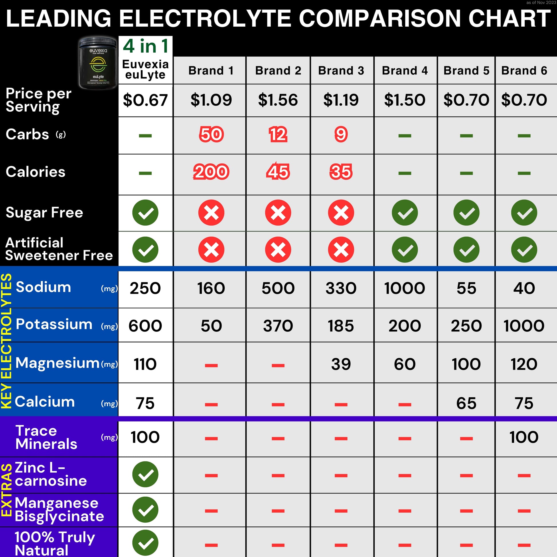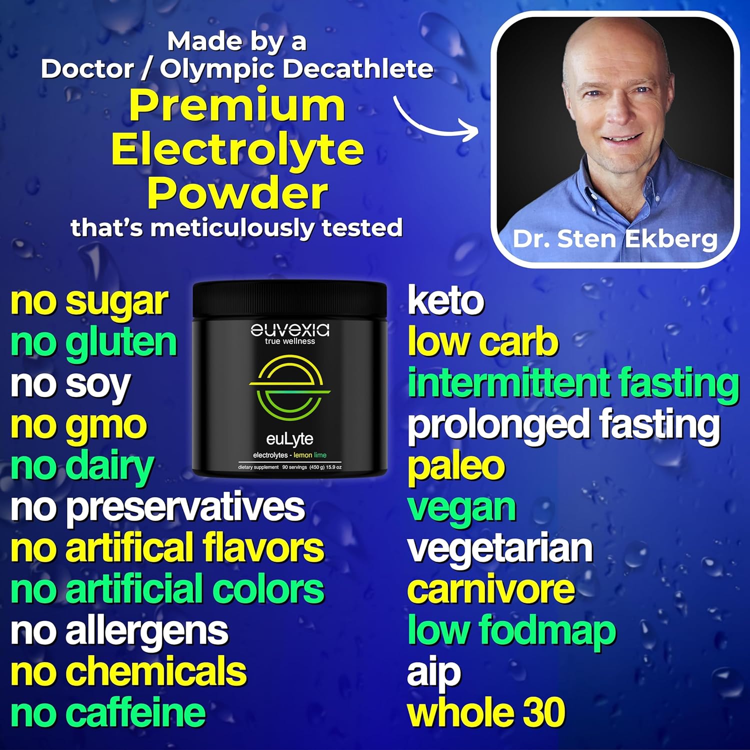 - DEVELOPED BY OLYMPIC DECATHLETE & DOCTOR, DR. STEN EKBERG: Euvexia euLyte's Natural Electrolytes Powder Formula is designed to support overall health for everyone, not just athletes. FREE from cheap fillers (sugar & table salt), dyes, GMOs, soy, egg, corn, dairy, nuts, yeast, caffeine, gluten, magnesium stearate, artificial preservatives, artificial ingredients, artificial sweeteners (sucralose, saccharin, acesulfame potassium, aspartame, maltodextrin). Ideal for health-conscious individuals #HealthChampions