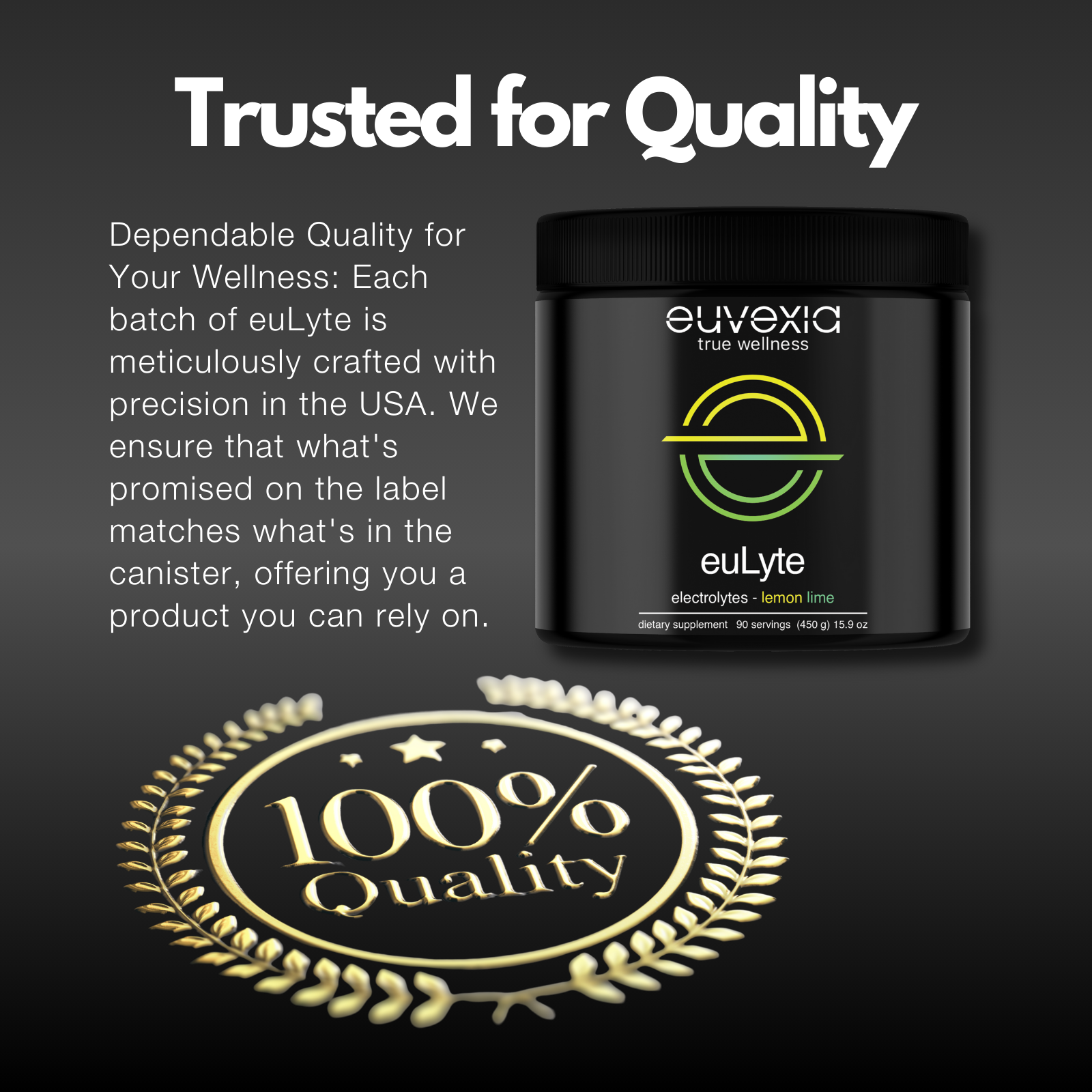 - MADE IN USA & STRICTLY TESTED: Euvexia's euLyte electrolytes powder is manufactured in a state-of-the-art facility located in the USA and extensively tested for purity. Our FDA-registered, NSF GMP-certified, and cGMP-certified facility follows strict quality standards (cGMP ensures the latest methods and technologies, while GMP meets basic quality standards). These facilities are uncompromising when it comes to cleanliness and quality control. Euvexia electrolytes proudly undergo third-party testing on every batch.
